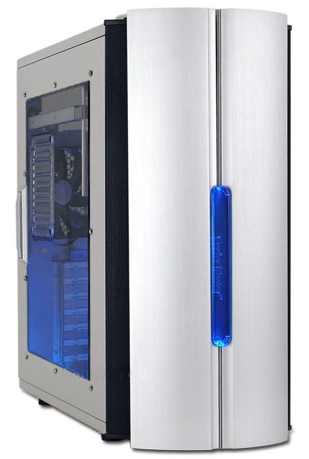 Innovativo case, costruito interamente in alluminio, con i due sportelli anteriori, meccanicamente connessi, che si aprono simultaneamente. Buona ventilazione, alloggiamento hard disk ad inserimento frontale (non interferiscono con la scheda madre). Predisposizione per il raffreddamento a liquido (esterno).