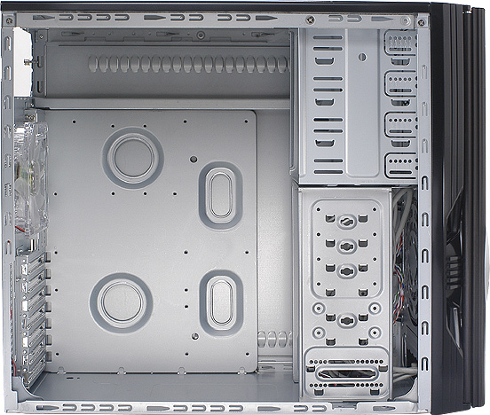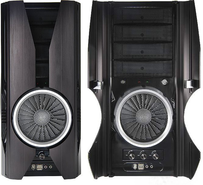 Case realizzato con solida struttura in acciao e frontale con due ante in alluminio che racchiudono l'accesso ai bay. E' dotato di 2 ventole una da 14 cm frontale e una da 25 cm laterale, quella frontale arricchita da turbina illuminata in blu. Ventola di espulsione da 12 cm posteriore non inclusa. Sono disponibili un controller per ventole a 3 canali e una presa Firewire 1394 frontale.