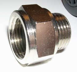 Adattatore che permette di montare raccordi con filetto maschio da 1/2 su accessori con filetto femmina 1/4.