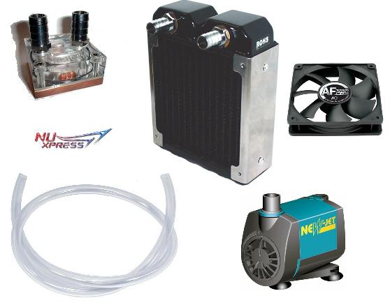 Kit di componenti che compongono un impianto a liquido professionale completo di tutto persino tubi.