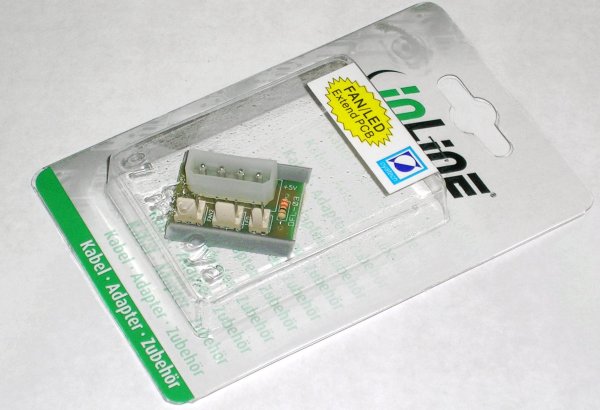 Adattatore che fornisce da un'alimentazione molex due uscite 3 pin per ventole e un'uscita led.