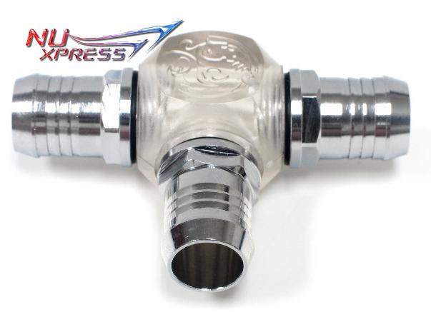 Raccordo che sostituisce una normale T dando modo di montare qualsiasi raccordo 1/4 e allo stesso tempo non strozza il flusso. Raccordi non inclusi