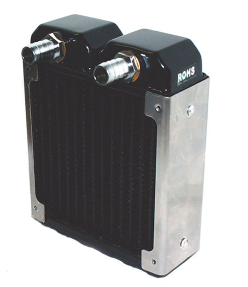 E' completamente in rame, a celle piatte, con doppia vaschetta separata in ottone, il tutto verniciato di nero e filettatura per raccordi 1/4G